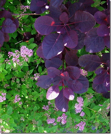 Finally, the last photo is a companionable pair I look forward to every year — purple smoke tree and spirea. They’re in the front walk, too, but not included in that photo.