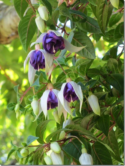 Brace yourself because spring has sprung and it’s time to start sharing the flower photos. It reached 98 degrees here at our Oregon Coast home last Wednesday – too hot to work in the garden, but I couldn’t bear to go inside, so I spent a good part of the day lounging in the cool grass under the cherry tree simply enjoying the garden view and making plans for improvements. In the morning I went flower shopping and came home with lots to fill the pots, but they’re just babies still, waiting for me to plant and fertilize them this weekend. Grow, babies, grow! To get a head start on the color I brought home a few fuchsia baskets.